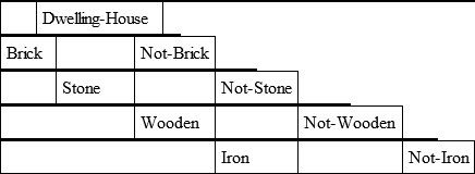 "The evident objection will at once be made, that houses may be built of other materials than those here specified. In Australia, houses are sometimes made of the bark of gum-trees; the Esquimaux live in snow houses; tents may be considered as canvas houses, and it is easy to conceive of houses made of terra-cotta, paper, straw, etc. All logical difficulties will, however, be avoided if I never make more than two species at each step, in the following way: —