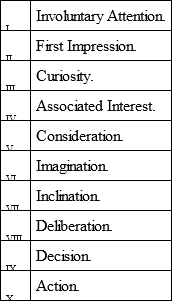 The several mental states manifested by every buyer in an original purchase are given below in the order of sequence in which they are usually manifested: —