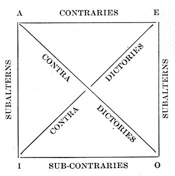 Thus, A and E are contraries; I and O are sub-contraries; A and I, and also E and O are subalterns; A and O, and also E and I are contradictories.