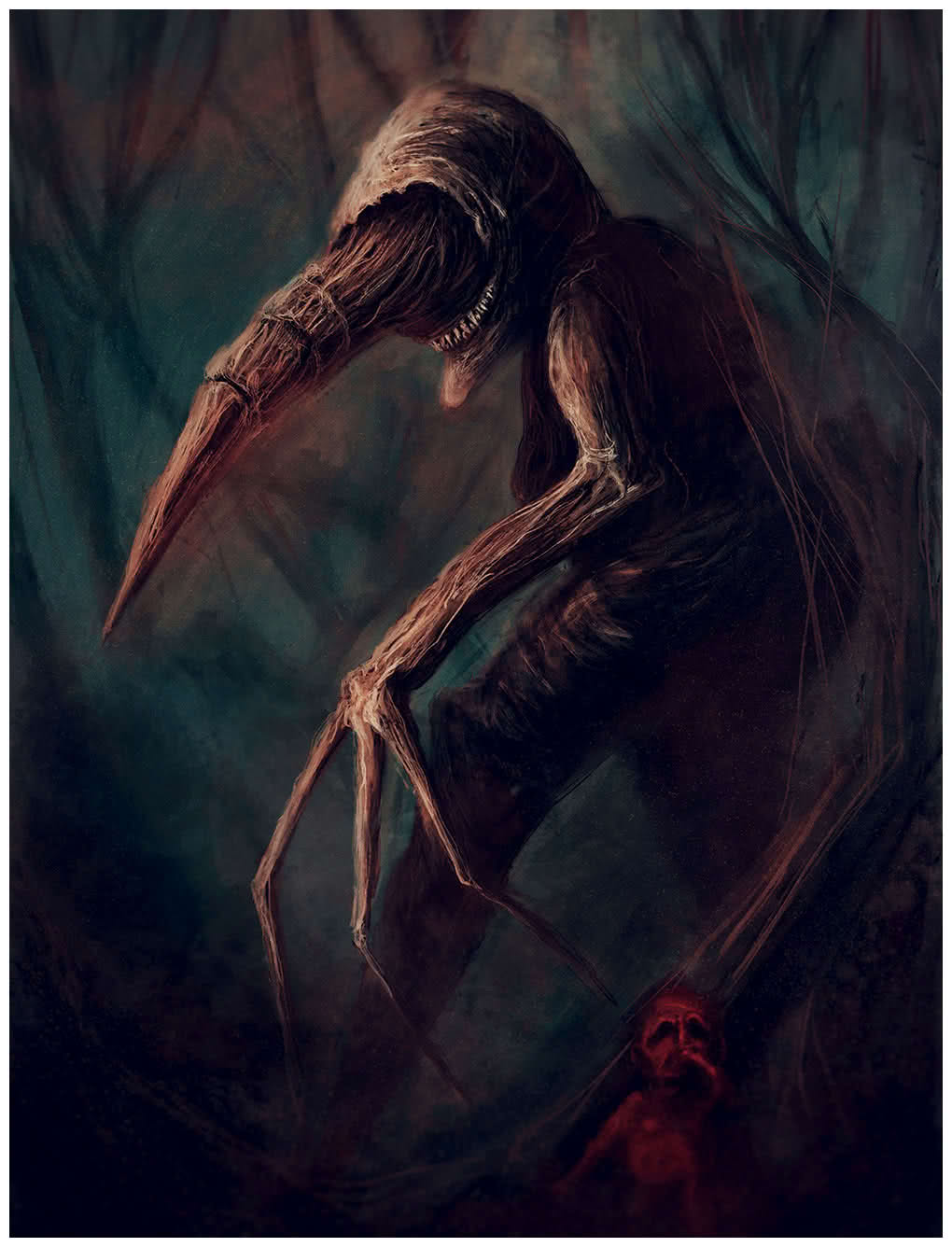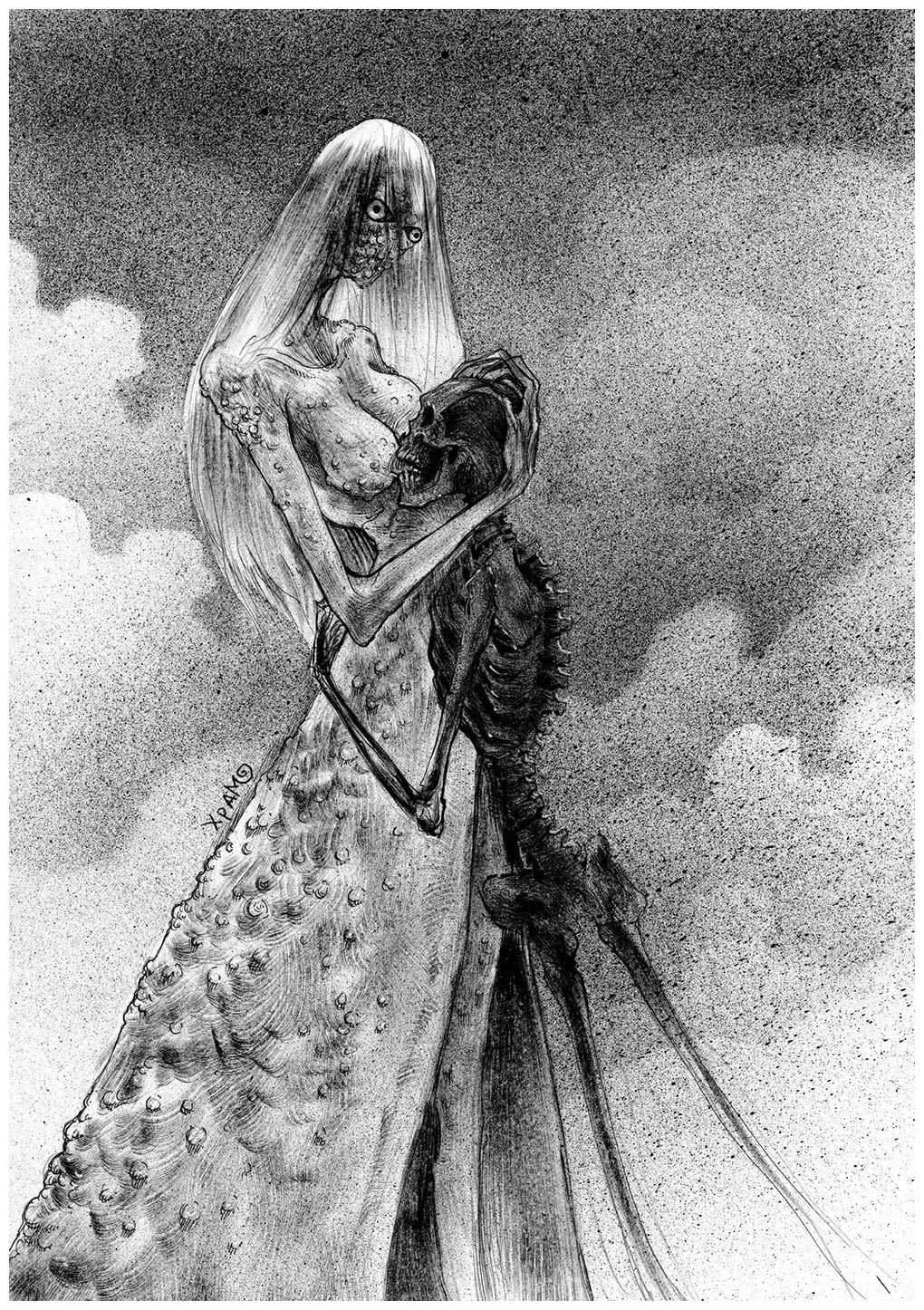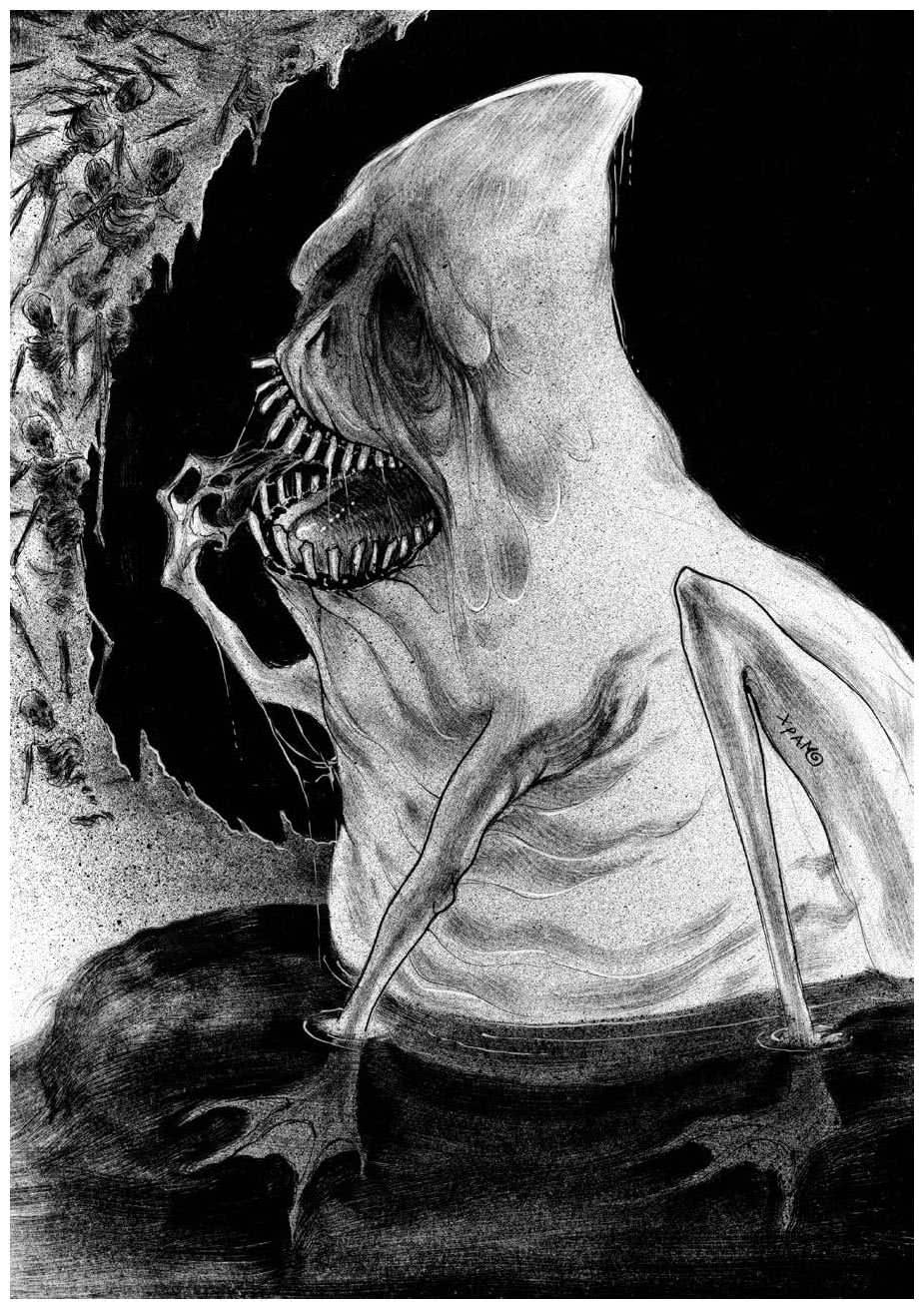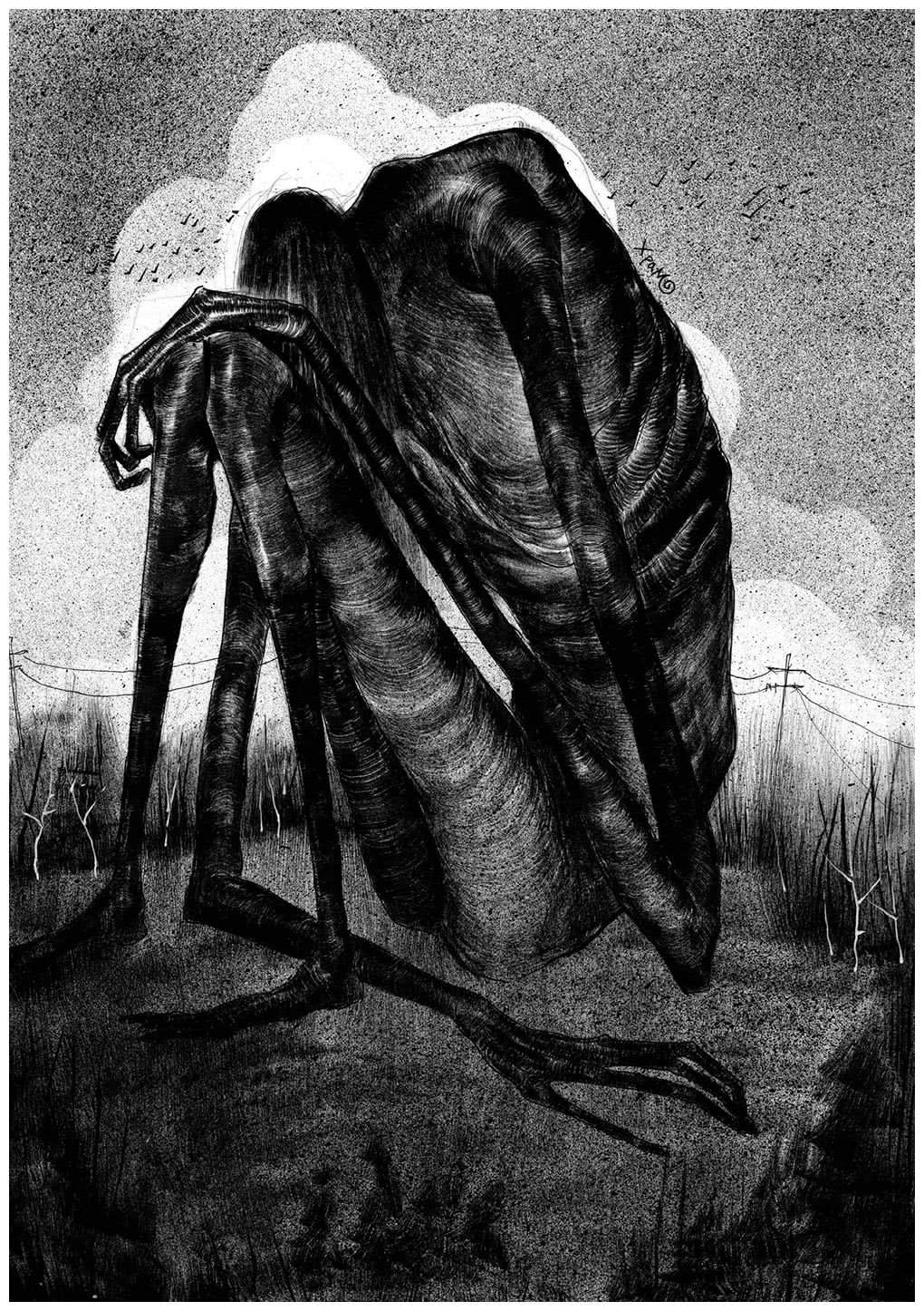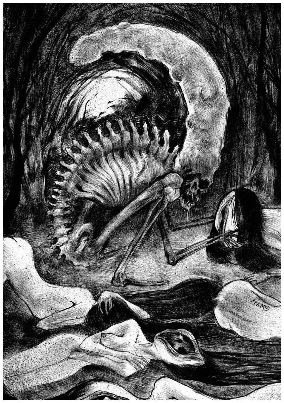 Чудовищный «Сифилис» удобно расположился среди обезволенных тел. его внешний вид и вид его жертв недвусмысленно намекают на природу болезни. при подготовке к работе над иллюстрациями тяжелее всего читалось именно про сифилис. я захотел передать эту тошнотворную тяжесть зрителю. чтобы при взгляде на рисунок его терзало желание отвернуться. и даже если эффект был достигнут единожды, я посчитаю задумку исполненной.