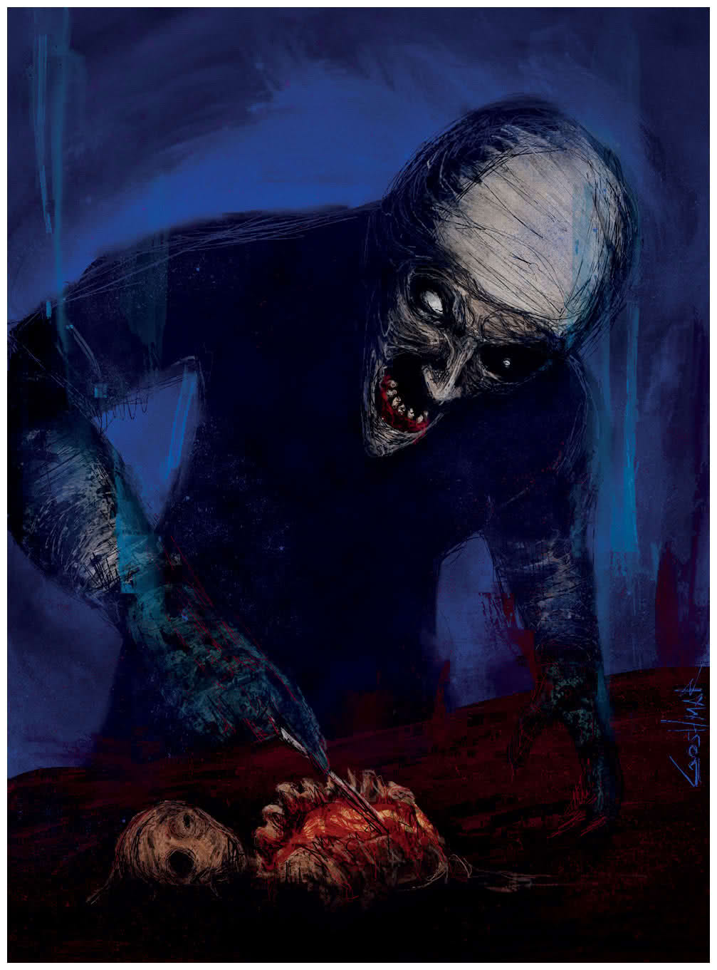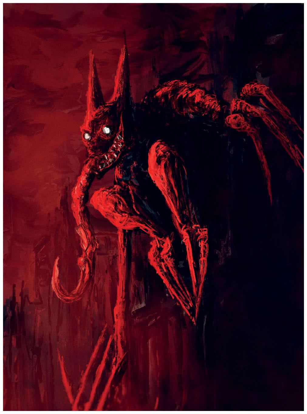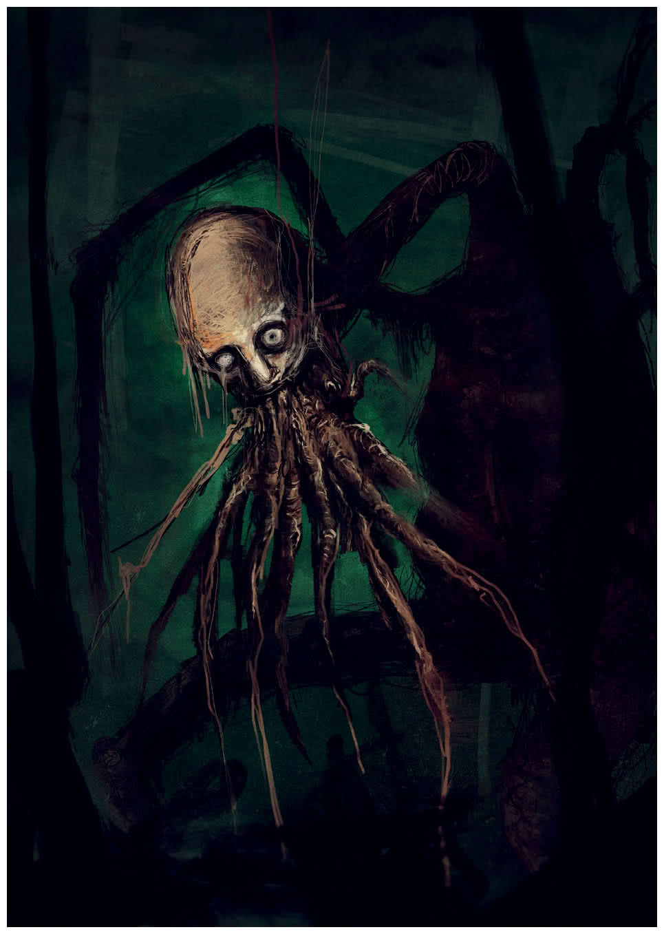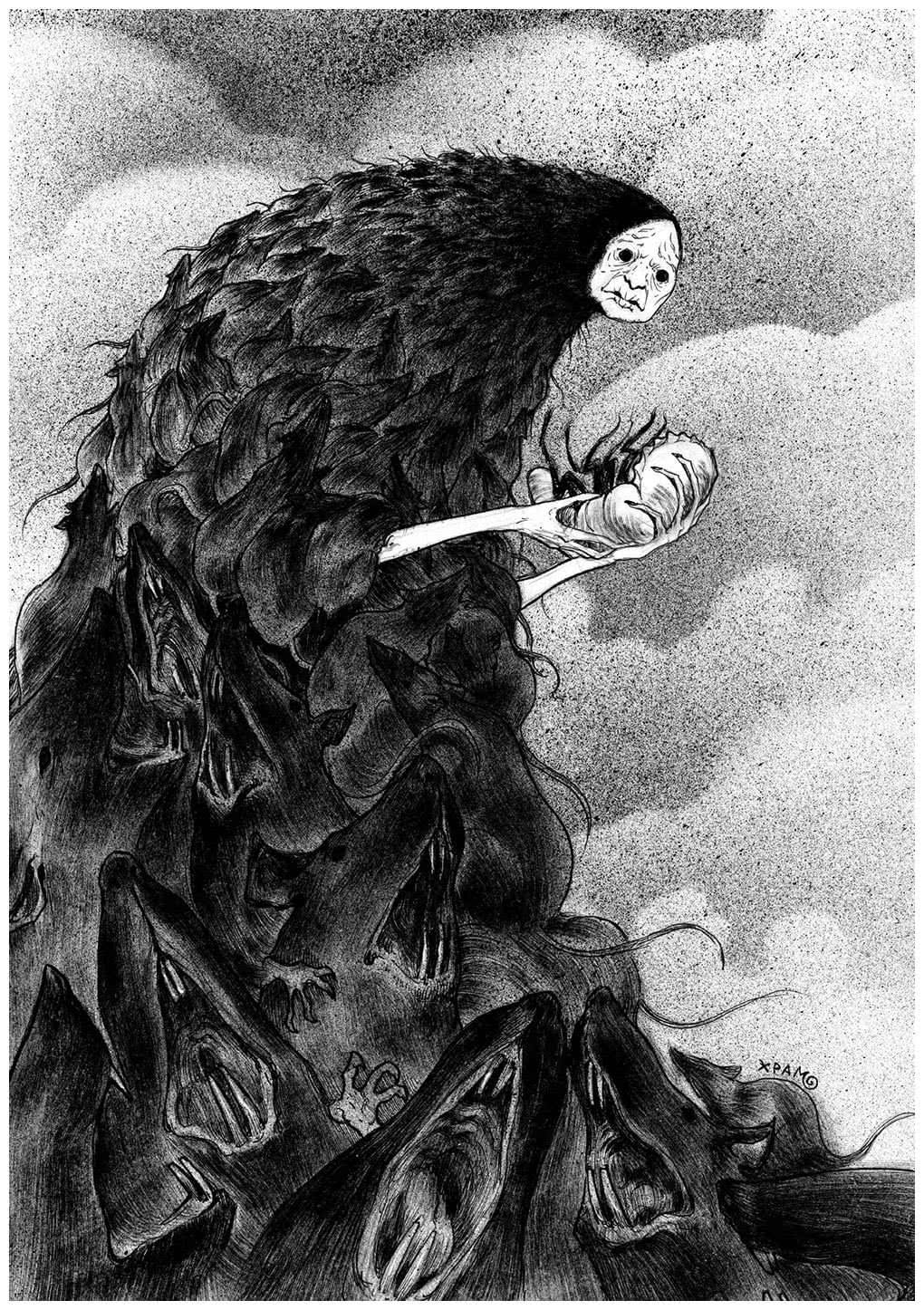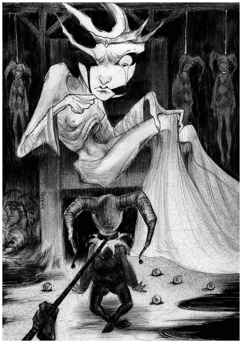 Чудовищный «Сифилис» удобно расположился среди обезволенных тел. его внешний вид и вид его жертв недвусмысленно намекают на природу болезни. при подготовке к работе над иллюстрациями тяжелее всего читалось именно про сифилис. я захотел передать эту тошнотворную тяжесть зрителю. чтобы при взгляде на рисунок его терзало желание отвернуться. и даже если эффект был достигнут единожды, я посчитаю задумку исполненной.