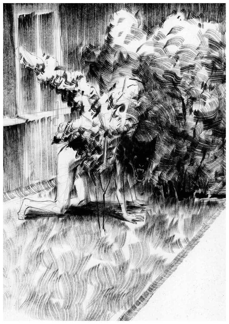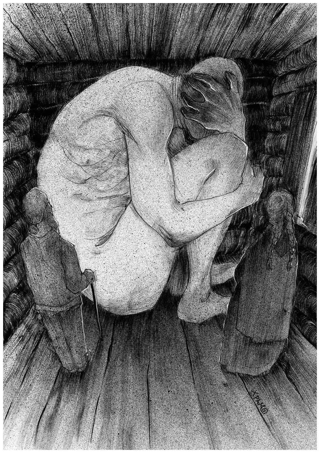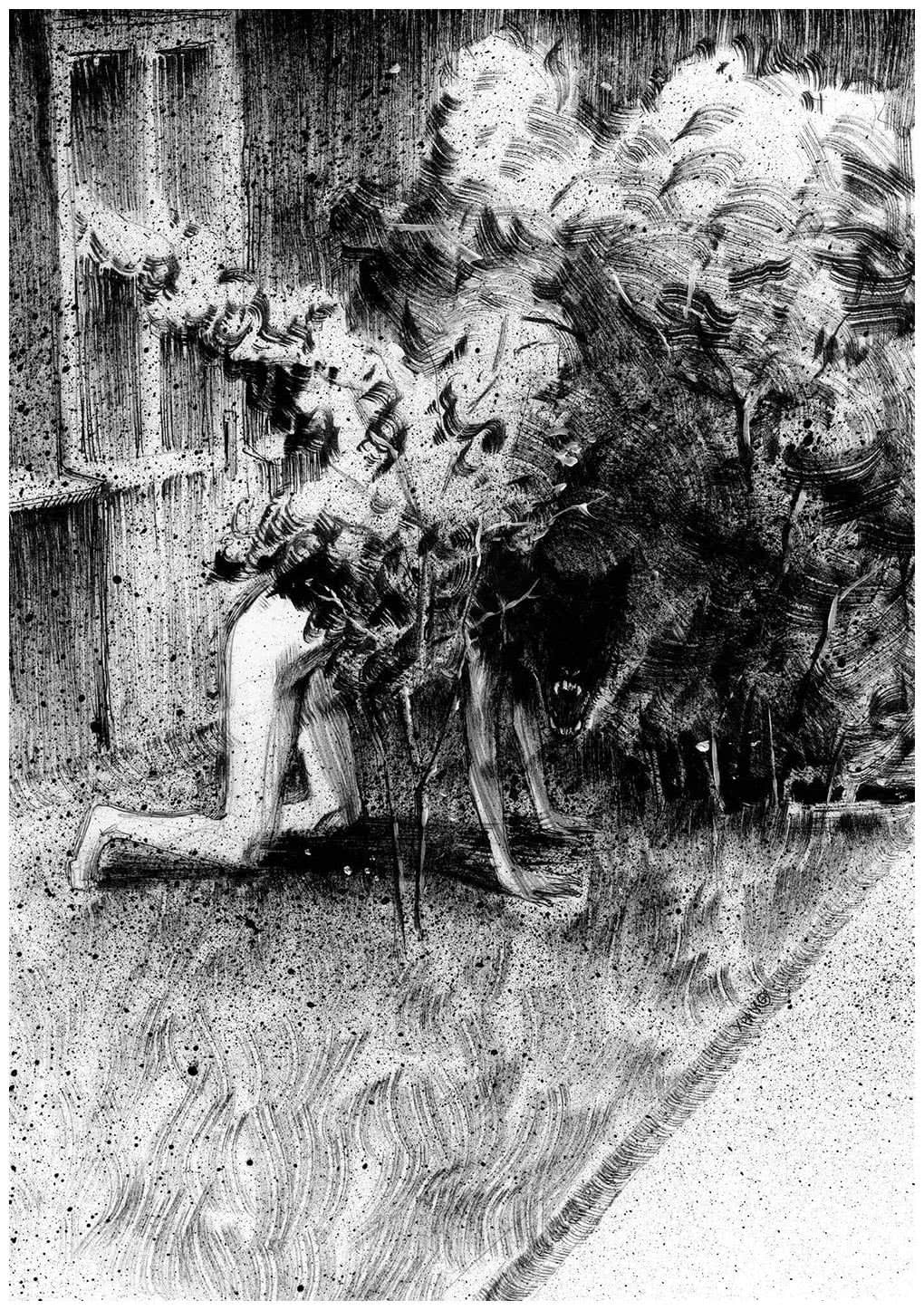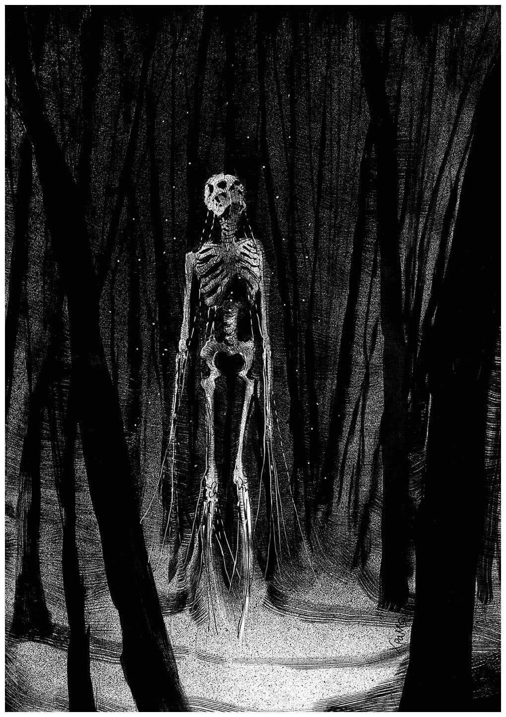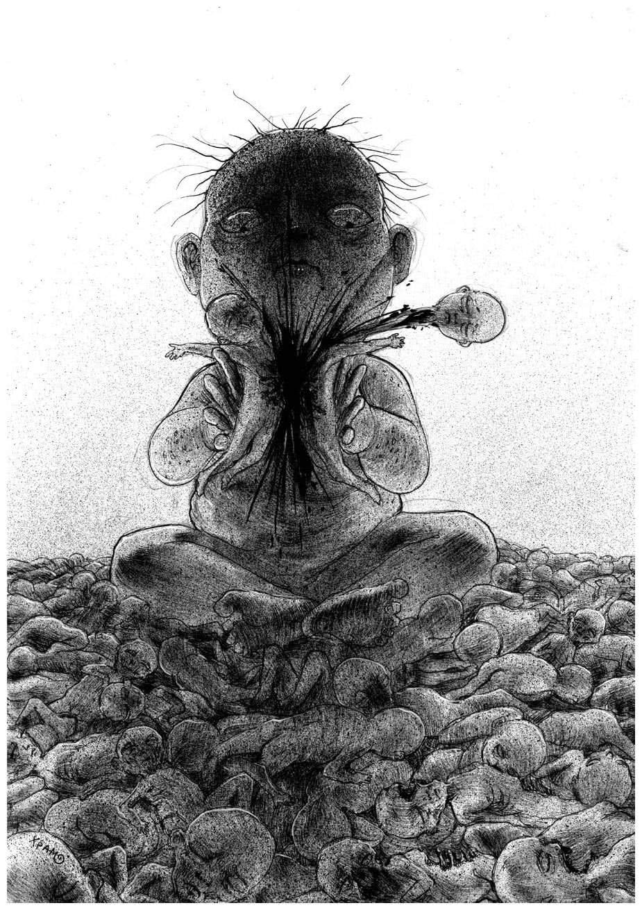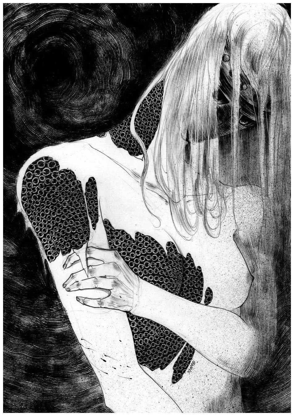 Чудовищный «Сифилис» удобно расположился среди обезволенных тел. его внешний вид и вид его жертв недвусмысленно намекают на природу болезни. при подготовке к работе над иллюстрациями тяжелее всего читалось именно про сифилис. я захотел передать эту тошнотворную тяжесть зрителю. чтобы при взгляде на рисунок его терзало желание отвернуться. и даже если эффект был достигнут единожды, я посчитаю задумку исполненной.