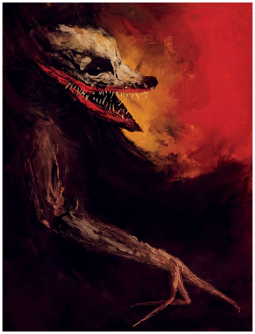 несмотря на открытую демонстрацию существа, хочется сохранить его вид загадочным и пугающим. поэтому сделаю морду темной, едва различимой, но с очертаниями факторов опасности: раскрытой пастью и зубами, зловеще белеющими в ее глубине. наметив общие тени, открываю монстру глаза, но отказываюсь от этой затеи по итогу – слишком много известных появляется в уравнении страха.
