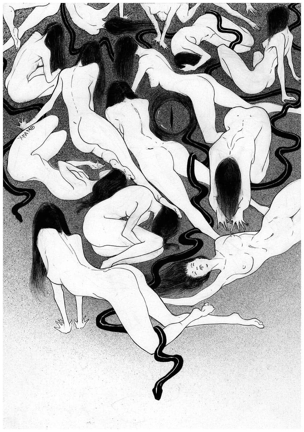 в случае со Змеем Горынычем я решил поступить коварнее: сделал его присутствие на картине метафизическим, отдав приоритет изображению его жертв. одна из рисующих персонажа черт – его любовь к узурпации женщин. короля играет свита, а похитителя невест – как ни странно, невесты. Опьяненные могуществом захватчика, несчастные девушки пребывают в обессиленных позах, образуя своими телами несколько сумбурный завораживающий пазл. завершающей деталью этого пазла выступает гипнотический змеиный глаз, взирающий на нас откуда-то извне.