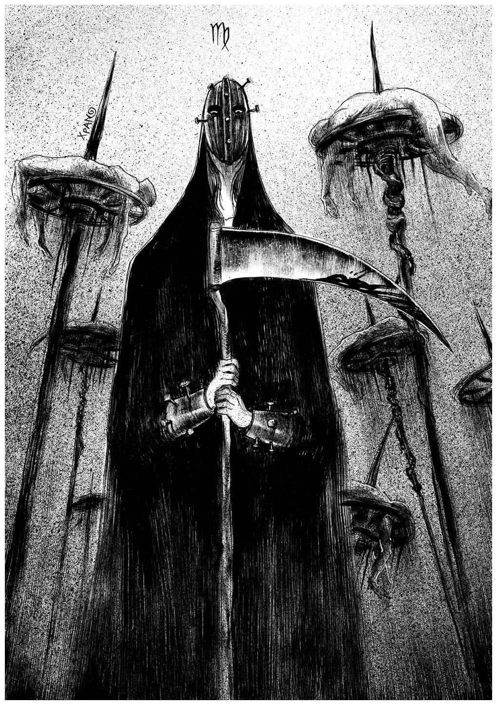 самое занимательное в интерпретации – ее бесконечный потенциал. всегда можно попробовать рассмотреть знакомый образ с разных сторон. например, я неоднократно изображал знаки зодиака, всякий раз придавая им индивидуальность, большую, чем это было предусмотрено их традиционным визуальным дизайном. вот три итерации Девы. все они различны, и нельзя сказать, что я активно опирался на характеристики, приписанные знаку. скорее моей кистью владели ассоциации: я представил, чем могла быть Дева и как она могла бы выглядеть в рамках темного фэнтези. одна из них оказалась кровавым карателем, движимым искаженными идеями праведности и наказания. другая – светловолосая воительница болезненного вида. ее кожа элегантно спускается с плеча и груди, обнажая кольчужную плоть. но девушка не желает показывать свою сущность: она бережно придерживает как оставшуюся кожу, так и внешнюю женственность. последняя из трех вырезала свое сердце и поместила в грудную клетку собственную голову в надежде навсегда остаться хладнокровной и беспристрастной. для этого она даже выколола глаза.