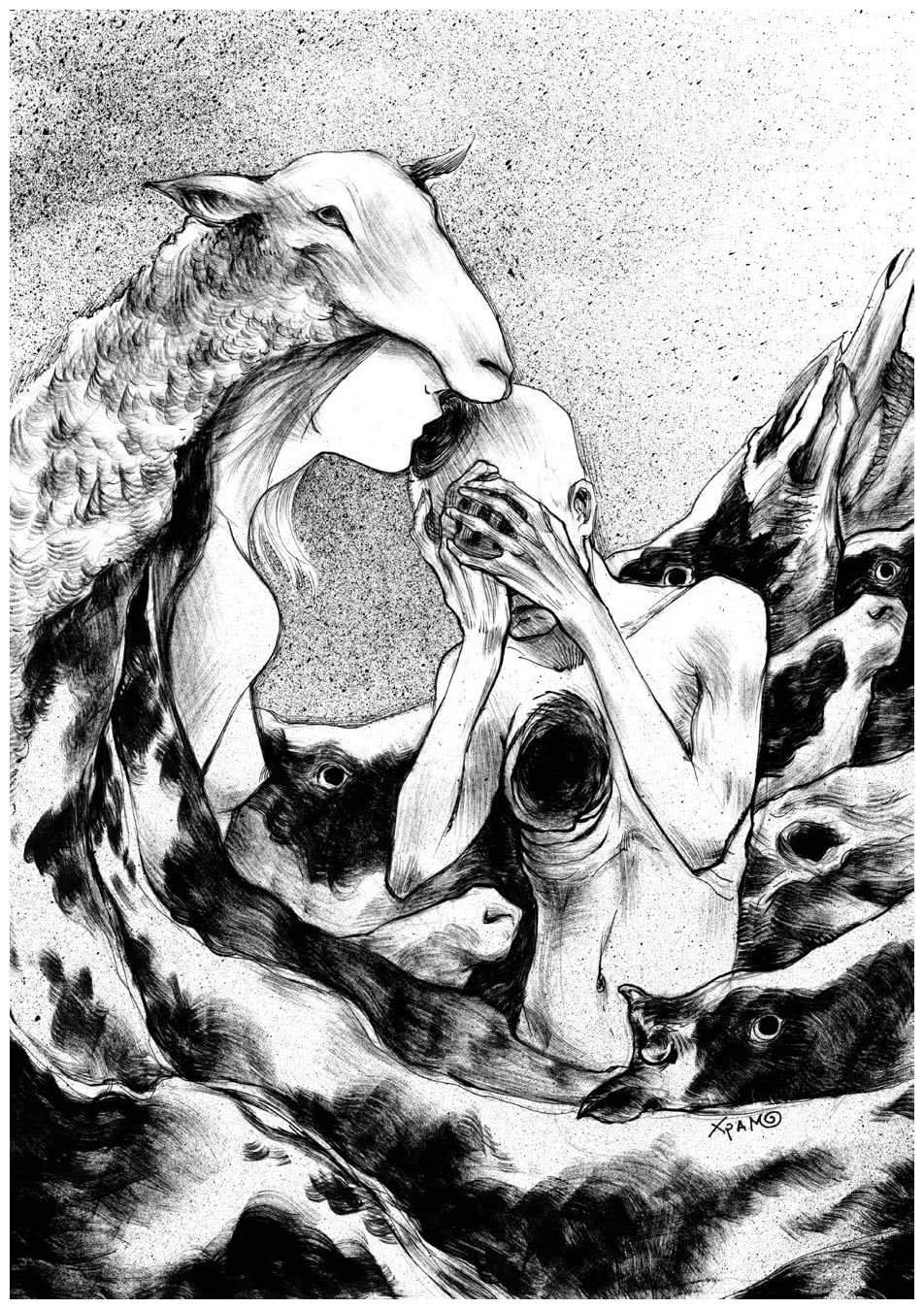 «Сибирская язва» продолжает тему смертоносной женственности, что красной линией идет сквозь все мое творчество. облаченная в одеяние из шкур то ли мертвых коров, то ли все еще живого скота, Сибирская язва нежно, по-матерински, целует юношу в лоб. каждый ее поцелуй оставляет незаживающую рану не только в месте касания губ, но и в самом сердце. рискую предположить, что под невинной, как это водится, овечьей шкурой скрывается чудовище. чудовище столь прекрасное, что нет сил ему сопротивляться.