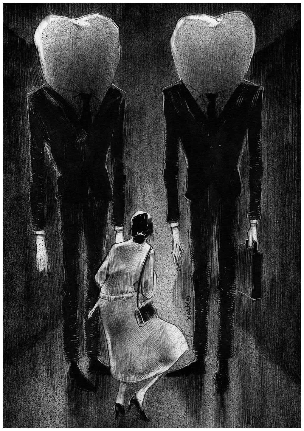«Зубы» выросли такими большими, что перестали быть частью рта. теперь они вполне самостоятельные, серьезные и страшные. деловые костюмы создают ложное впечатление сдержанности. не будем наивными: когда зубы растут, они чешутся и заставляют что-то грызть. у дамы, случайно попавшейся злодеям под руку, едва ли завидная участь. я отчего-то уверен, что Зубы перетрут ее в кровавый порошок.