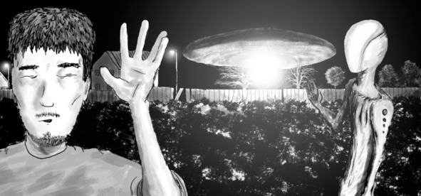 Я встал, оттолкнулся от кровати, подлетел к окну. Вижу, как над моим домом поднимается металлический диск. Да это же летающая тарелка! Ну прям как по липовым каналам показывают – вся ртутного цвета, блестит от ближних фонарей. Но вот лампочек на ней нет – просто как толстый ртутный блинчик. Представьте себе ртутный блинчик, или капельку ртути, которая упала на какую-то поверхность и немного растеклась. Выходит, этот парень прогнал пришельцев, – они покинули нас. Но что им было надо? Я? Жалкий человек?