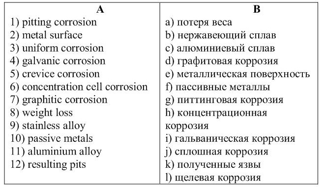 Разрушение металлов – electrical current – термодинамическая неустойчивость – conductivity – коррозийная среда – rust – электрохимическая коррозия – gradual destruction – руда – mechanical damage – ионное состояние – condenser tubes – металлическая конструкция.
