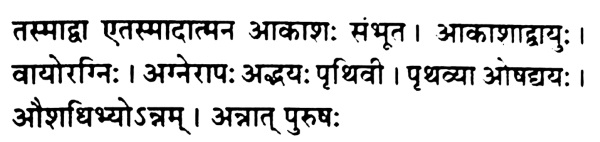 Из Абсолюта (Пара-шакти изначального семени) был создан эфир, из эфира – воздух, из воздуха – тепло (огонь), из огня – вода, из воды – земля. Из земли были созданы растения (травы), из пищи были созданы тела. Так из Пара-шакти были сотворены пять элементов, пища и тела, в то время как над эфиром – стадия кала Ишвары и Ишвари.