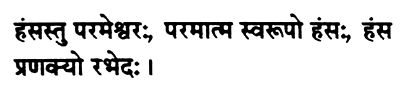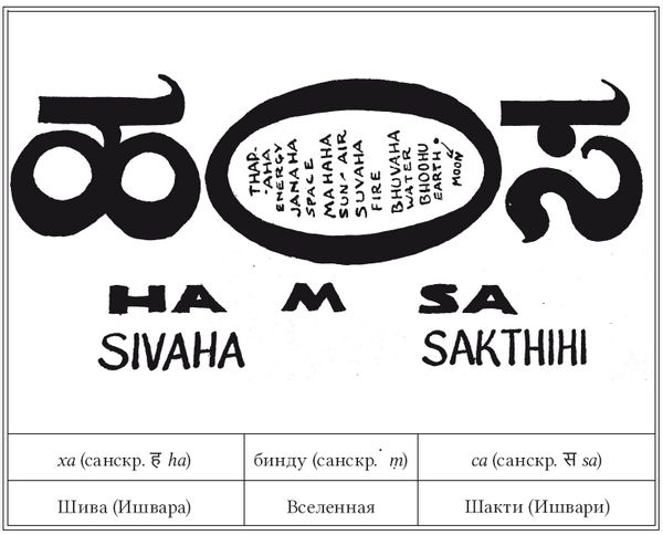 Вышеприведенная диаграмма хам-са62 (см. диаграмму 1) передаёт суть Вселенной, раскрываемую в её существовании. Слог ха63 эквивалентен Шиве, слог са64 – Шакти. Анусвара или бинду (в форме яйца), касающаяся ха и са, символизирует Вселенную. Вселенная была бинду (мельчайший квант энергии) в слоге ом (Высшей Сущности) в качестве силы-семени Вселенной. Ха – Шива (Ишвара) вверху диаграммы рассматривается как мужское. Са – Шакти (Ишвари) внизу рассматривается как женское. Имеющая форму яйца Вселенная находится в равновесии между Ишварой и Ишвари. Вселенная несёт энергию, содержащуюся в ха и са. Притяжение вверх со стороны ха и притяжение вниз со стороны са, означающее притяжение мужским принципом женского и притяжение женским – мужского, приводит к производству потомства.
