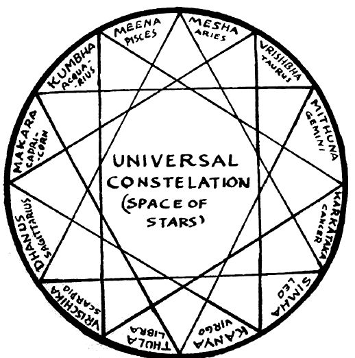 Они называются Двенадцатью Адитьями77 и указывают на характерные особенности каждого из зодиакальных созвездий. Так же и Луна путешествует по 27 звёздам78 небесного свода, получая их имена. Остальные планеты также проходят по этим звёздам, хотя и не изменяя своих названий. Поскольку только Луна получает имена этих звёзд, её79 называют их царём (или мужем)80. Солнце, Луна и звёзды – не инертные мёртвые тела, а полные жизни существа. Всё сказанное подтверждается авторитетом Вед, так что нет никакого сомнения, что такая картина допустима.81 Перейдём теперь к рассмотрению собственно космических центров и центров человека.