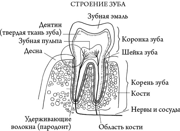 Потребление богатого углеводами фастфуда, этой пищи цивилизованного человека, провоцирует бактерию Streptococcus mutans вырабатывать из сахара клейкое вещество. Оно крепко пристает к зубу, начинается ферментация углеводов, образуются кислоты. Показатель рН, который во рту обычно около 6,0, падает до очень кислотных значений – ниже 5,0, и вот уже содержащиеся в эмали минералы растворяются, эмаль разрушается, точно облитая кислотой мраморная скульптура, ставшая жертвой вандалов. А поскольку в зубной эмали, как и в дентине, есть микроскопически мелкие каналы, то все кислое, холодное и горячее она доносит до сердца зуба. Там залегает так называемая пульпа – живое мясо, пронизанное многочисленными кровеносными сосудами и нервными волокнами. Тут уж в буквальном смысле прочувствуешь, каково это – попробовать [что-то] на зуб. Неблагоприятная кишечная флора понижает усвоение кальция из пищи, а как раз кальция зубу и не хватает. (Об этом поговорим подробнее в главе про синдром раздраженного кишечника)