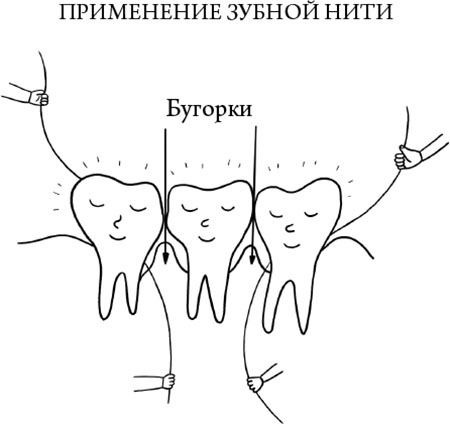 Зубная нить добирается до мест, куда у зубной щетки нет шансов попасть. Пользоваться ею нужно раз в один-два дня. Эффективнее всего почистить межзубные пространства получается немного шершавой, невощеной нитью. Для чистки более крупных щелей между зубами или мостов есть специальные щеточки. Важно пройтись вдоль с обеих сторон каждого зуба до самой глубины, до розового бугорка. Так не только удаляется грязный зубной налет, но заодно и воздух попадает в щель, что не нравится анаэробным, то есть не любящим воздуха, вонючим и тухлым бактериям и обезвреживает их. Кровь при чистке нитью означает, что десна воспалена, а не то, что вы действовали слишком брутально, – так что продолжайте!