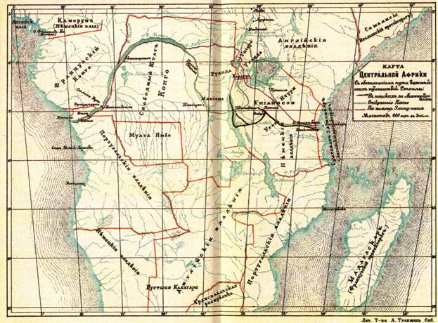 Из Занзибара Стэнли отправился в Египет и здесь в Каире написал книгу, посвященную только что оконченному путешествию. Книга эта представляет собою два тома в тысячу страниц большого формата, набранных убористым шрифтом. Этот громаднейший труд Стэнли выполнил в 50 дней, то есть с такой невероятной быстротою, которую трудно и представить. Книга, по мере написания ее, немедленно переводилась с английского на французский и немецкий и вышла одновременно на трех языках. На издание ее потребовалось гораздо более времени нежели на ее составление, а именно четыре месяца. Книга была напечатана в громадном числе экземпляров и, несмотря на высокую цену, около 200 рублей, моментально разошлась, так что понадобилось тотчас же новое издание. В первые же три месяца по выходе книги появилось десять переводов ее на разные языки.