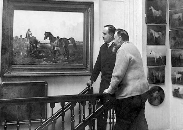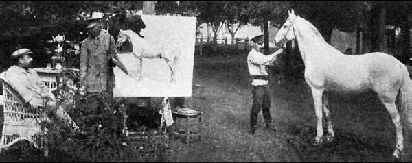Н. С. Самокиш пишет портрет знаменитого Громадного (отца Крепыша) в конном заводе Я. И. Бутовича в имении Прилепы. 1912 г.