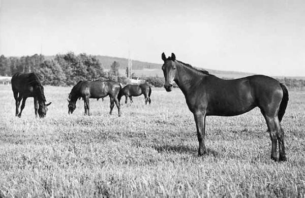 Полуторники Пермского конного завода в табуне. Линия Ловчего, семейство Будущности, Прилепского конезавода Я. И. Бутовича.