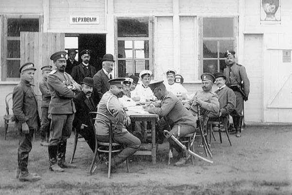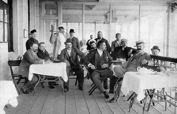 За столиком слева А. А. Щёкин, Н. С. Пейч, С. А. Шпажников (стоит), М. М. Шапшал; за столиком справа С. Н. Коншин, А. Н. Крыжановский (стоит), С. И. Гирня, С. А. Похвиснев.