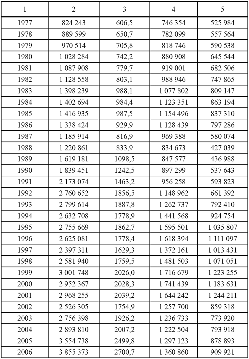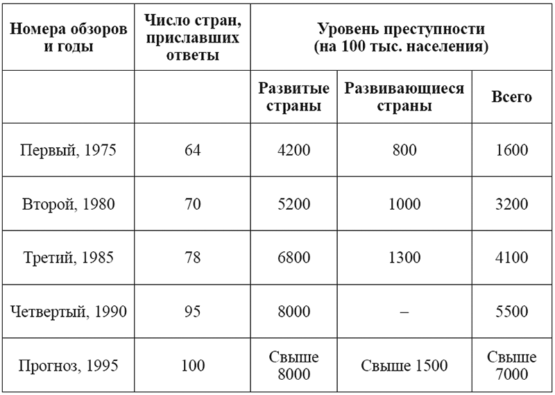 Хорошо известно, что после Второй мировой войны основной общемировой тенденцией являлся абсолютный и относительный (в расчете на 100 тыс. населения) рост регистрируемой преступности. Этот вывод основывается, прежде всего, на анализе четырех обзоров ООН, предпринятом В.В. Лунеевым (Табл. I)[75]. Аналогичные сведения публикуют и иные источники[76].