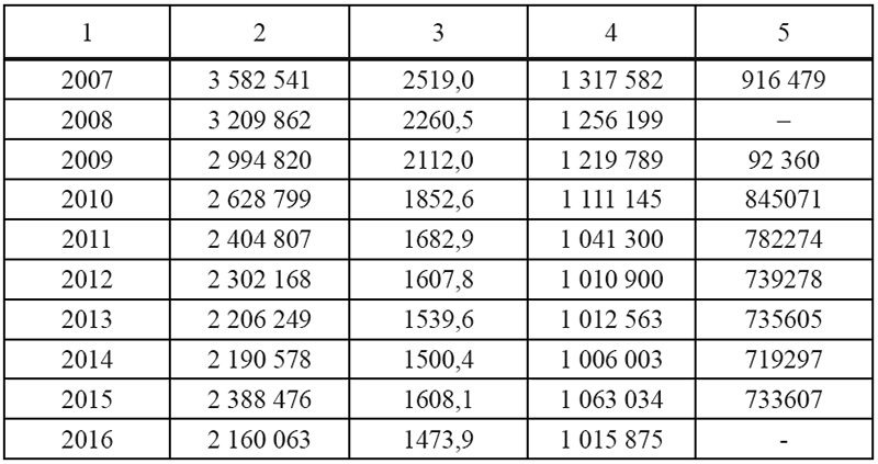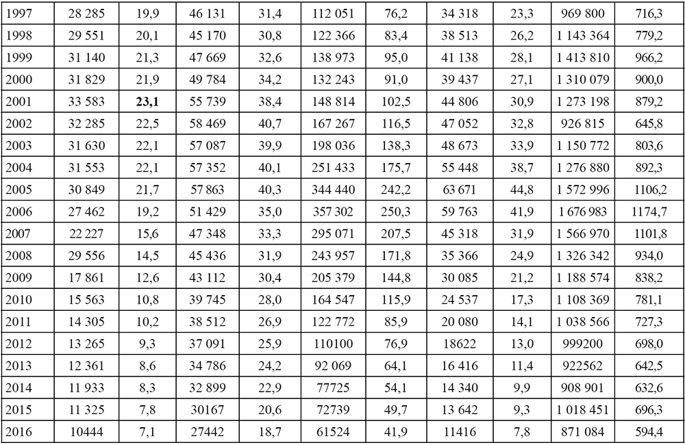 Как мы видим из табл. 2, точно такая же картина наблюдается с динамикой преступности в России после 2006 г., а по ряду преступлений – с 2001–2006 гг. (Табл. 4). Незначительный рост в 2015 г. предположительно может объясняться ростом краж (Табл. 4) в связи с ухудшимся экономическим положением (это подтверждается продолжающимся и в 2015–2016 гг. снижением уровня других преступлений, в частности, тяжких насильственных преступлений).