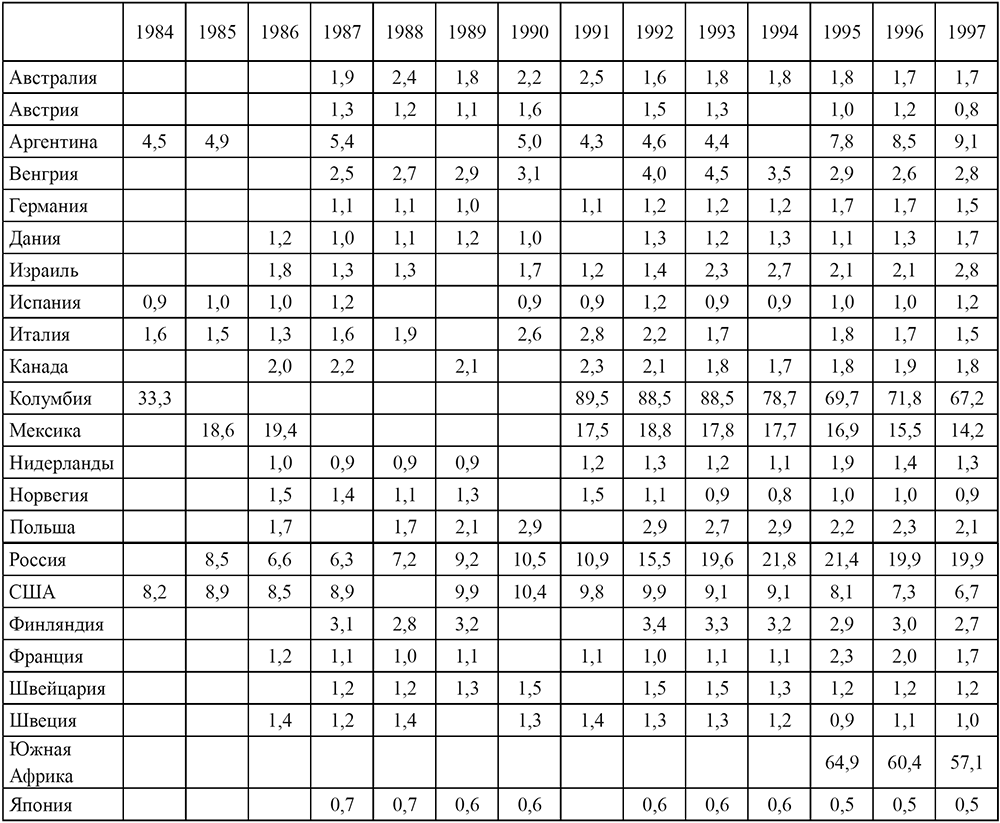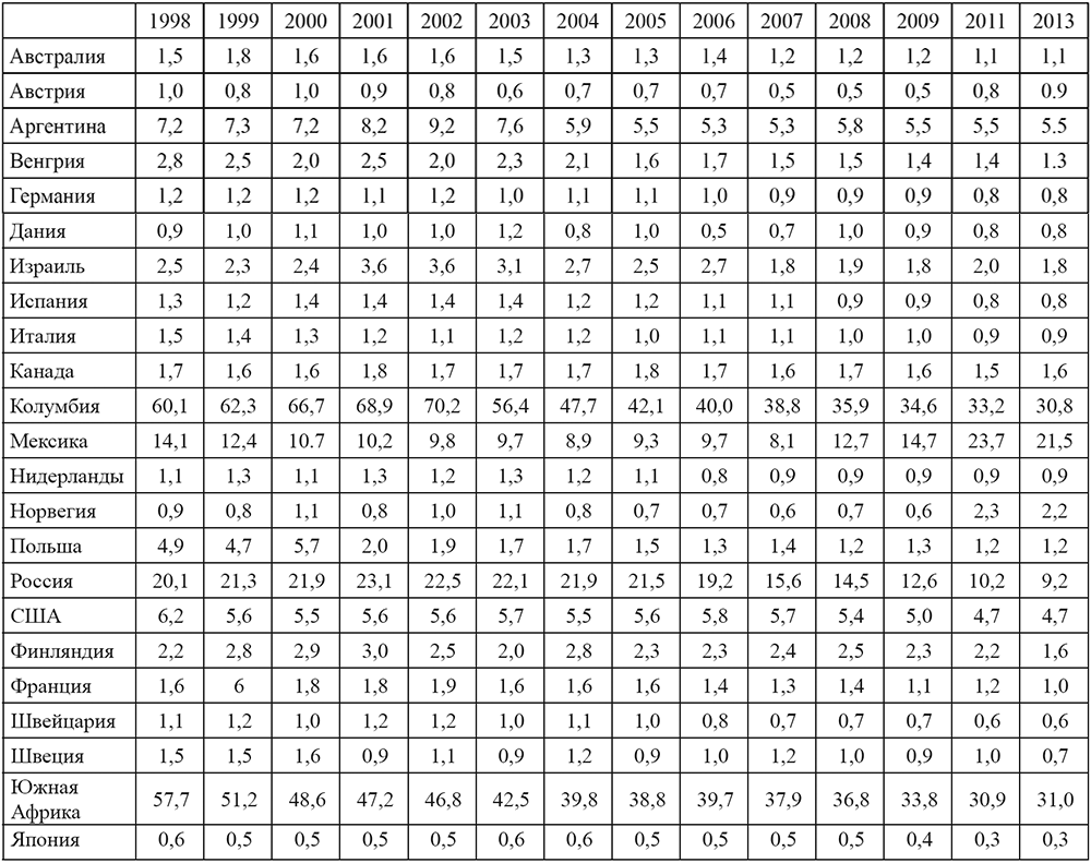 Таблица 3. Уровень на (100 тыс. населения) смертности от убийств в некоторых государствах (1984-2013)