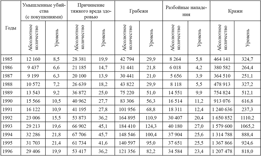 Начиная обзор состояния преступности и основных тенденций ее изменений, необходимо напомнить, что мы можем судить только о зарегистрированной ее части, а потому любые наши суждения будут носить относительный, ориентировочный характер, лишь более или менее приближенный к реальной ситуации. С другой стороны, нельзя совсем пренебречь имеющимися данными уголовной статистики и, по возможности, результатами исследований, ибо они составляют необходимую эмпирическую базу для теоретических рассуждений. Кроме того, даже относительно неполные данные, проанализированные за ряд лет. позволяют выявить тенденции преступности.