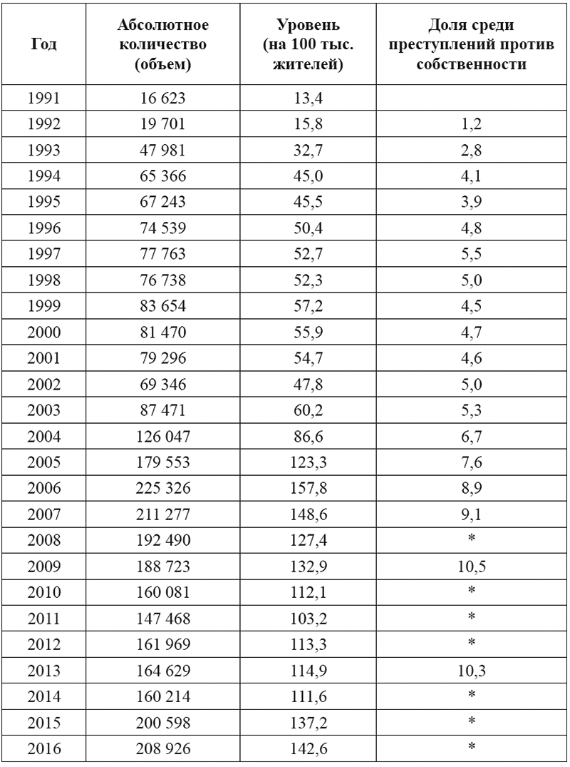 В-третьих, имеет место «переструктуризация» преступности, когда «обычную» преступность теснят малоизученные и почти не регистрируемые, высоколатентные виды преступлений эпохи постмодерна, в частности, киберпреступность. Так, по данным, представленным на XVI ежегодной конференции Европейского общества криминологов (Мюнстер, 2016), если средняя раскрываемость «обычных» преступлений составляла 42–46 %, то киберпреступлений – 5 %… Переструктуризация. обусловленная особенностями постмодерна как общества потребления, возможна и среди «обычных» преступлений. Так, в России сокращающийся с 2006 г. уровень таких преступлений против собственности, как кражи, грабежи, разбои, «компенсируется» ростом мошенничества (Табл. 5). Это не удивительно: легальные средства обогащения ограничены. А из нелегальных (кража, грабеж, разбой, присвоение и растрата) мошенничество наиболее интеллектуально, «выгодно» и безопасно… Известно два основных способа мошенничества: обман и злоупотребление доверием. А вот количество видов мошенничества безмерно и постоянно растет, особенно в эпоху Интернета.