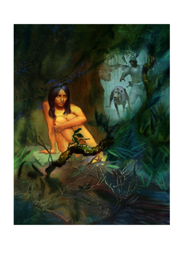 Первыми движутся ряды всадников, за ними шеренги аркебузиров и арбалетчиков. Помимо шпаг на перевязи они несут подставки для аркебуз и колчаны со стрелами для могучих стальных арбалетов. В конце колонны идут щитоносцы с небольшими круглыми щитами в руках. Во главе процессии ведут огромных свирепых псов, лютых андалузских догов, натасканных на травлю и кровавую расправу с аборигенами Америки. В Новом Свете без них, – потомков знаменитой породы собак римских легионеров, не обходится ни один поход. Они выслеживают индейцев и принимают участие в битвах. Зубы, когти этих сущих дьяволов причиняют не меньший урон, чем мечи и пули их хозяев.