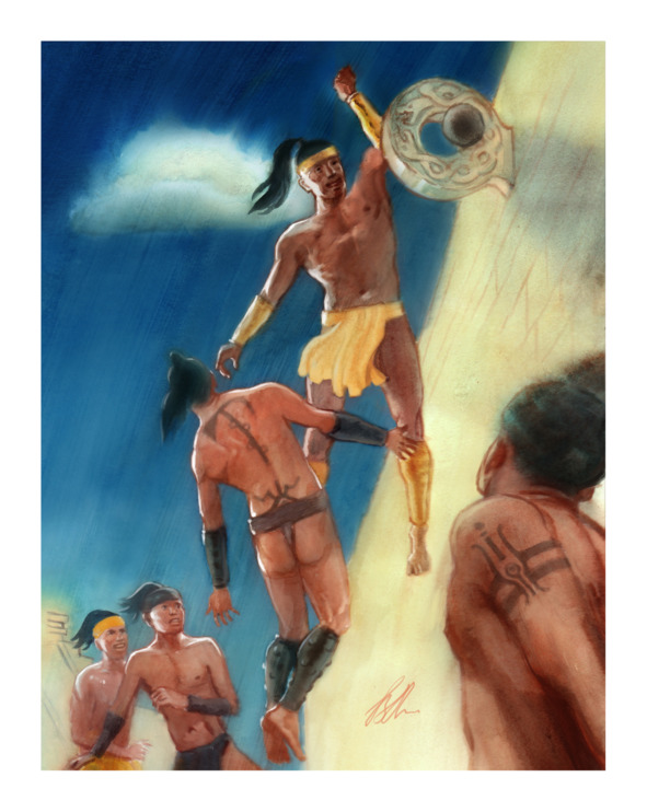 Игра затягивалась, зрители нервничали, игроки устали и ошибались все чаще. Воспользовавшись промахом тикальцев, лучший игрок Копана знаменитый Каменный Локоть, капитан команды, ловко перехватив мяч, несильно посланный кем-то из соперников, мгновенно подбросил его и нанес удар мощной битой. Каучуковый мяч молнией влетел в узкое кольцо тикальцев, на миг застыл и в жуткой тишине замершего стадиона проскочил через него.