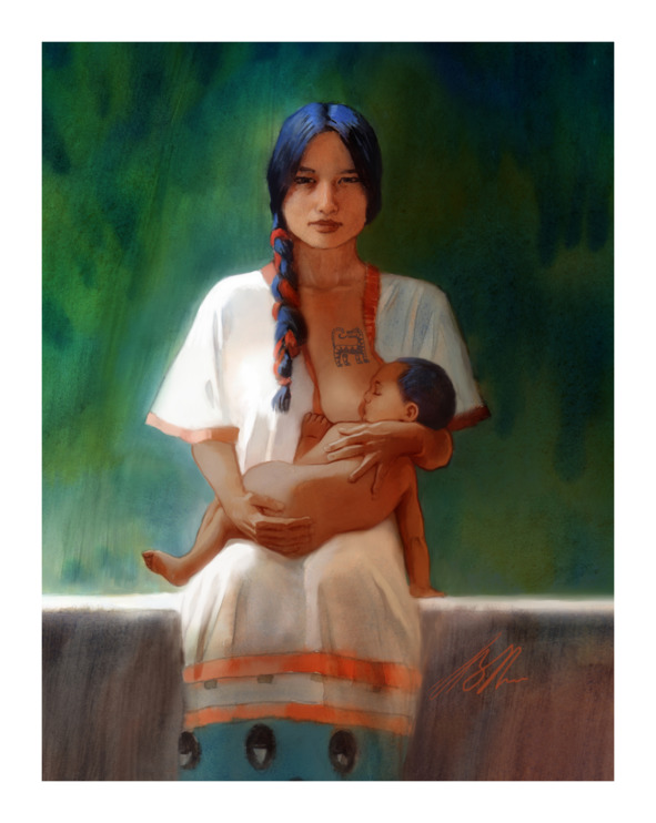 Тогда на трибуне стадиона сидела первая красавица города Копан – фигуристая жена главного героя матча, кормящая их первенца обнаженной левой грудью. На ней, разбухшей от материнского молока, красовалась свежая татуировка оскалившегося ягуара – самого грозного хищника Центральной Америки, главного покровителя всех мужчин-воинов майя!! Видя его у красавицы, все понимали, что она родила мальчика – Будущего Воина и, как его доблестный отец, …игрока в «пок-та-пок»!!