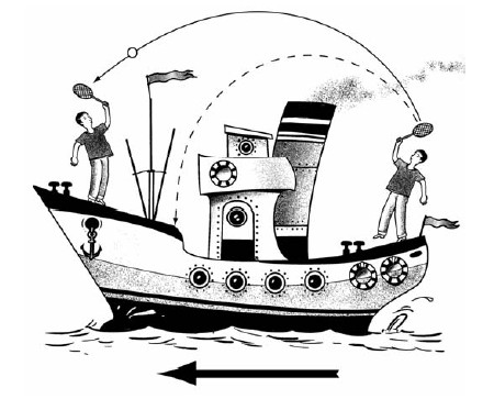 Это кажется на первый взгляд неправдоподобным: ведь мяч, брошенный к носу парохода, должен догонять стоящего там игрока, который несется вперед вместе с пароходом; напротив, мяч, брошенный к корме, летит к игроку, который несется ему навстречу. Безусловно так; но надо помнить и то, что к скорости мяча, брошенного от кормы к носу, прибавляется скорость парохода, а от скорости мяча, брошенного к корме, скорость парохода отнимается. Поэтому невыгода первого мяча смягчается, а выгода второго понижается, и оба мяча оказываются в одинаковых условиях.