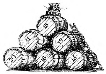 В магазин доставили 6 бочек керосина. На рис. 1 обозначено, сколько ведер было в каждой бочке. В первый же день нашлось два покупателя; один купил целиком две бочки, другой – три, причем первый купил вдвое меньше керосина, чем второй. Так что не пришлось даже раскупоривать бочки.