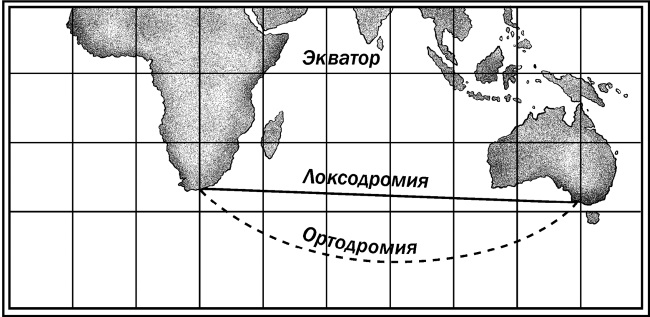 Рис. 1. На морской карте кратчайший путь от мыса Доброй Надежды до южной оконечности Австралии обозначается не прямой линией («локсодромией»), а кривой («ортодромией»)