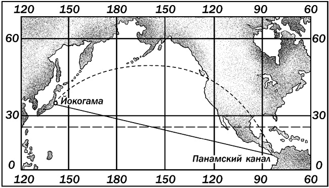 Еще поразительнее следующее утверждение: изображенный на рис. 2 кружный путь из Японии к Панамскому каналу короче прямой линии, проведенной между ними на той же карте!