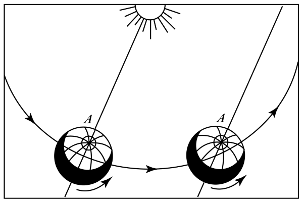 Рис. 6. Почему солнечные сутки длиннее звездных? (Подробности в тексте)