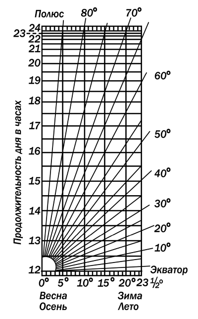 Точная продолжительность дня для каждого места и любой даты года может быть вычислена по таблицам астрономического ежегодника. Нашему читателю едва ли, однако, понадобится для обиходных целей подобная точность; если он готов удовольствоваться сравнительно грубым приближением, то хорошую службу сослужит ему прилагаемый чертеж (рис. 8). Вдоль левого его края показана в часах п р о д о л ж и т е л ь н о с т ь д н я. Вдоль нижнего края нанесено угловое расстояние Солнца от небесного экватора. Это расстояние, измеряемое в градусах, называется «склонением» Солнца. Наконец, косые линии отвечают различным широтам мест наблюдения.