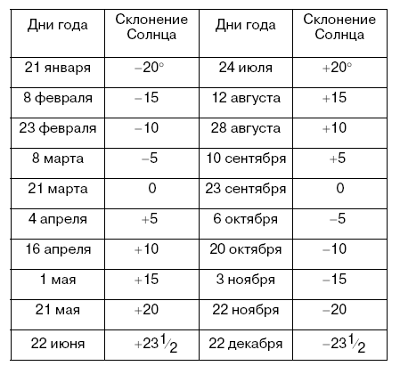 Чтобы пользоваться чертежом, надо знать, как велико угловое расстояние («склонение») Солнца от экватора в ту или иную сторону для различных дней года. Соответствующие данные указаны в табличке на стр. 23.