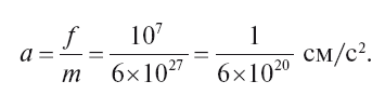 Пусть сила, с какой человек напирает на земной шар, равна 10 Н, т. е. около 10 000 000 дин. Мы рискуем запутаться в выкладках, если не прибегнем здесь к сокращённому обозначению больших чисел: 10 000 000 = 107. Масса земного шара равна 6 × 1027 г. Поэтому величина искомого ускорения