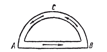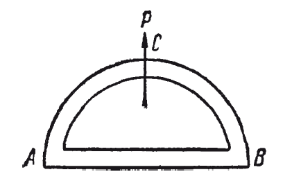 К какого рода заблуждениям приводит изобретателей пренебрежение рассматриваемым законом, показывает следующий поучительный пример – проект летательной машины совершенно нового типа. Представим себе, говорит изобретатель, замкнутую трубу (рис. 12), состоящую из двух частей: горизонтальной прямой АВ и дугообразной части АСВ над ней. В трубах имеется жидкость, которая непрерывно течёт в одном направлении (течение поддерживается вращением винтов, размещённых в трубах). Течение жидкости в дугообразной части АСВ трубы сопровождается центробежным давлением на наружную стенку. Получается некоторое усилие Р (рис. 13), направленное вверх, усилие, которому никакая другая сила не противодействует, так как движение жидкости по прямому пути АВ не сопровождается центробежным давлением. Изобретатель делает отсюда тот вывод, что при достаточной скорости течения сила Р должна увлечь весь аппарат вверх.