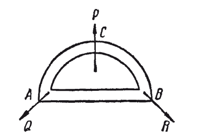 Нетрудно указать, в чём именно заключается ошибка. Автор проекта не принял во внимание, что центробежное давление должно возникать не только в кривой части АС В пути жидкости, но и в точках А и В поворота течения (рис. 14). Хотя кривой путь там и не длинен, зато повороты очень круты (радиус кривизны мал). А известно, что чем круче поворот (чем меньше радиус кривизны), тем центробежный эффект сильнее. Вследствие этого на поворотах должны действовать ещё две силы Q и R, направленные наружу; равнодействующая этих сил направлена вниз и уравновешивает силу Р. Изобретатель проглядел эти силы. Но и не зная о них, он мог бы понять непригодность своего проекта, если бы ему был известен закон движения центра тяжести.
