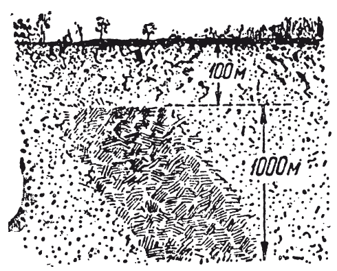 Рис. 18. Причина Курской аномалии: шток железной руды мощностью около 1000 м на глубине 100 м