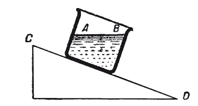 ЗадачаСосуд с водой стоит на наклонной плоскости (рис. 19). Пока он неподвижен, уровень АВ воды в нём, конечно, горизонтален. Но вот сосуд начинает скользить по хорошо смазанной плоскости СВ. Останется ли уровень воды в сосуде горизонтальным, пока сосуд скользит по плоскости?