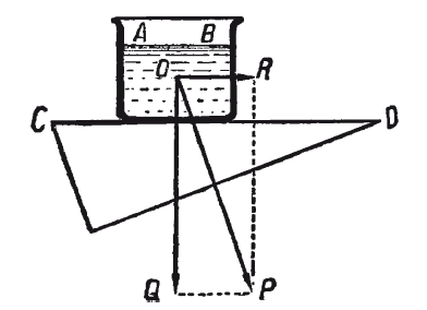 Но следует ли это также из приведённого ранее объяснения? Конечно. Ведь в случае равномерного движения сосуда по наклонной плоскости частицы стенок сосуда не получают никакого ускорения; частицы же жидкости в сосуде, находясь под действием силы R, будут силой R придавливаться к передней стенке сосуда. Следовательно, каждая частица воды будет находиться под действием двух придавливающих сил R и Q, равнодействующая которых и есть вес Р частицы, направленный вертикально. Вот почему уровень воды должен в этом случае установиться горизонтально. Только в самом начале движения, когда сосуд, до получения постоянной скорости, ещё движется ускоренно[20], уровень воды принимает на мгновение наклонное положение.