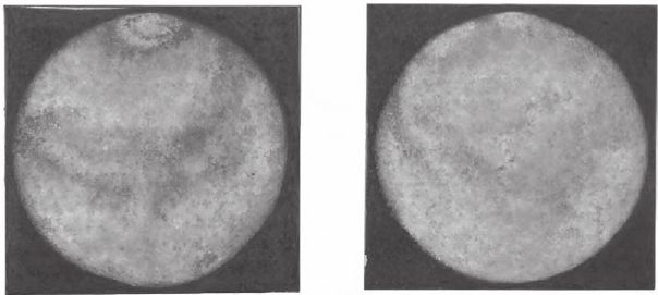 (По фотографиям проф. Геля 24 сентября и 5 октября 1909 г.). Полярная белая «шапка» Марса успела в течение немногих дней заметно уменьшиться