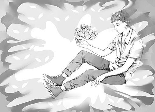 На картине был изображен мальчик с черной дырой в сердце, из которой вырывались мрачные тени – призраки. Но, достигнув неба, они превращались в ангелов. В руках мальчик держал белый лотос, который освещал всю тьму человеческих сердец и тьму этого мира.