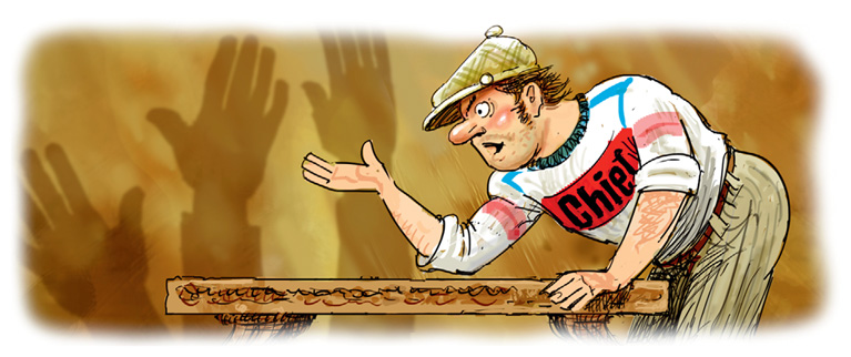 В комнате находился ещё один человек, который не поднял пальцы вверх. На нём была футболка в сине-бело-красную полоску. И на красной полоске чёрными буквами выделялась надпись «Chief».