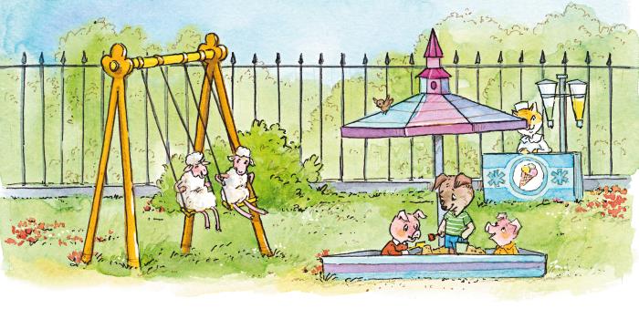 На площади стоит ратуша. Поскольку никто никуда не спешит, вместо часов на ратуше висит календарь. Налево от ратуши раскинулся парк. Несколько ягнят качаются на качелях, а в песочнице щенята пекут пирожки.