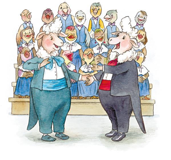 Чуть подальше разливались звучные песни хора певчих птиц. Особенно возбуждёнными казались поющие овцы Альрик и Ульрик, которым предстояло исполнять сольные номера. Господин Нильссон сочинил в честь мисс Люнт заздравный стих на мелодию «Бе-бе, белая овечка», и Альрик с Ульриком то и дело запевали: