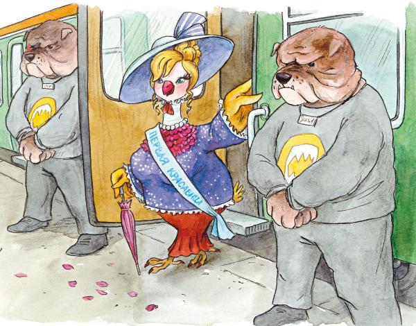 Начальник станции, крыса Рулле Рэльс, поднял зелёный флажок, давая сигнал, что путь свободен. А накануне он на здании вокзала укрепил американские флажки, чтобы иностранная курица чувствовала себя как дома.