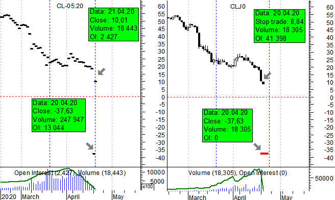 На Рис. 13 фьючерс CL-05.20 (левая часть) и CLJ0[12] (правая часть), временной интервал – день, период – с 17.02.20 по 21.04.20, вид – японские свечи.